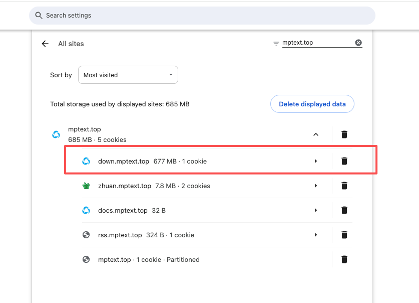 down.mptext.top域名。 - 点击右侧的垃圾桶图标删除该站点的所有存储数据(包括 IndexedDB、Cookies 等)。